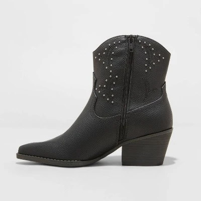 Two-step in standout style with these Twyla Western Boots from Universal Thread™. Complete with a smart 2.25-inch block heel and a classic pointed-toe front, they feature a faux-leather design with metal studs perfect for adding flair to any outfit. Plus, the soft memory foam insole offers comfortable walking and dancing, while a side zipper makes for easy on and off.