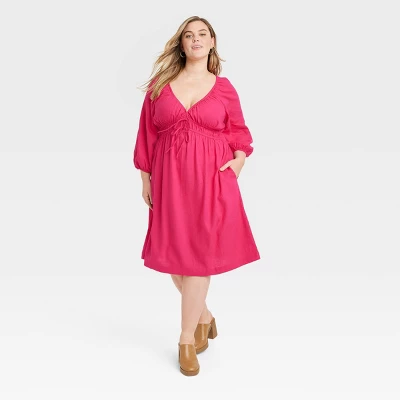 Dress up your casual looks with this Tie-Front Puff 3/4 Sleeve Midi Dress from Universal Thread™. This puff 3/4-sleeve dress in a solid color is tailored in a midi length. It features a deep breezy V-neck, functional side pockets and a tie front with gathered detailing around the waist for cinched-in style. The lightweight and breathable fabric offers cool comfort and the pullover style offers easy wear. Simply add the footwear of your choice to complete the chic look.
